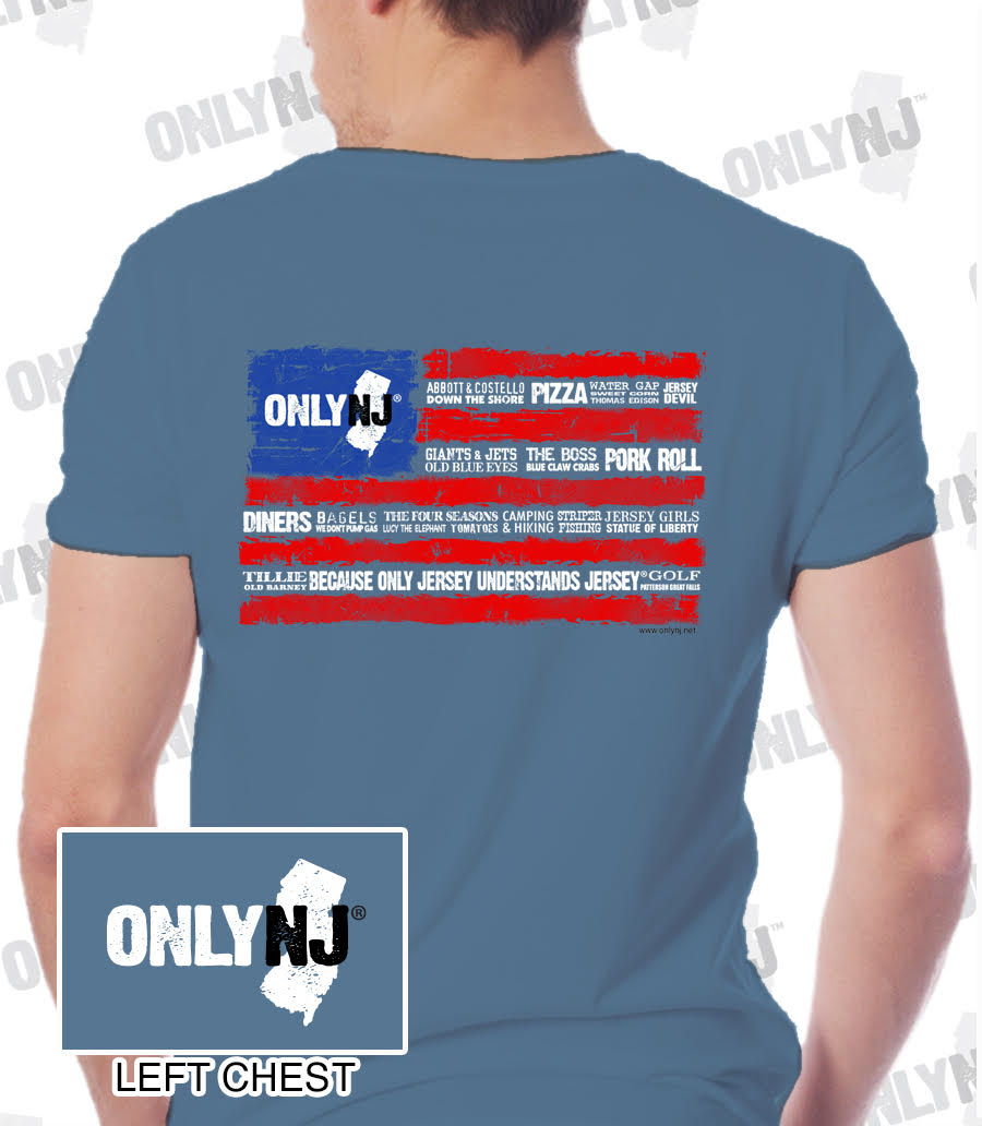 100% Cotton Heavyweight Pigment Dyed T-Shirt with High Quality Silkscreened Image featuring patriotic flag which lists all kinds of cool NJ people, places and things!